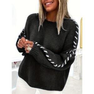 Round neck color-block pullover. Long sleeves, soft knit for autumn/winter comfort. Stylish, versatile top for effortless casual wear.