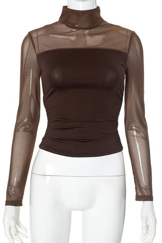 Women’s Autumn Top. Half-turtleneck with chic mesh patchwork in versatile brown. A stylish, textured essential for your fall wardrobe.
