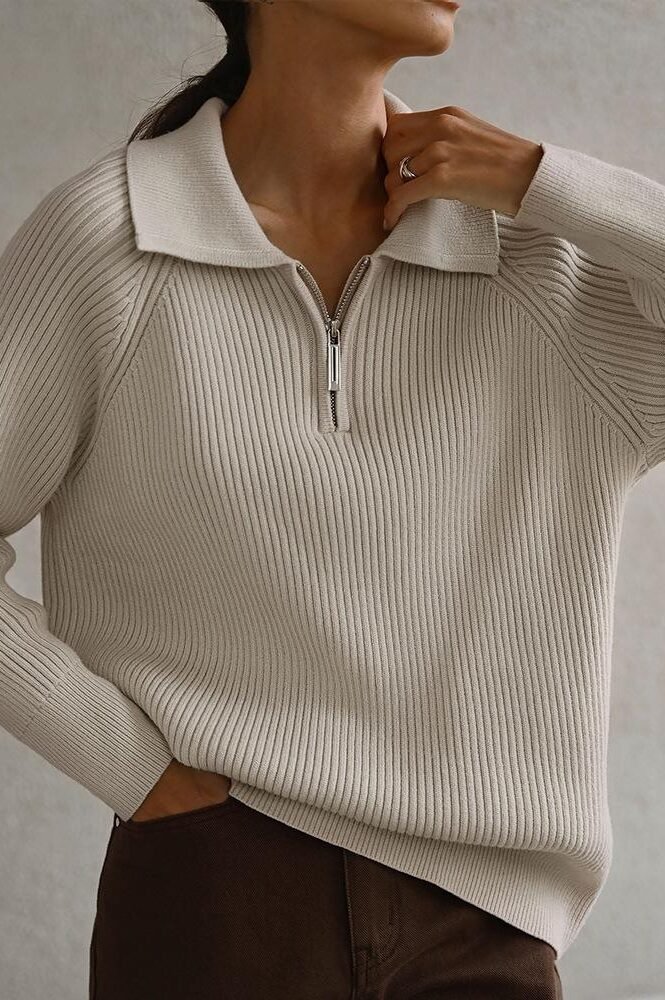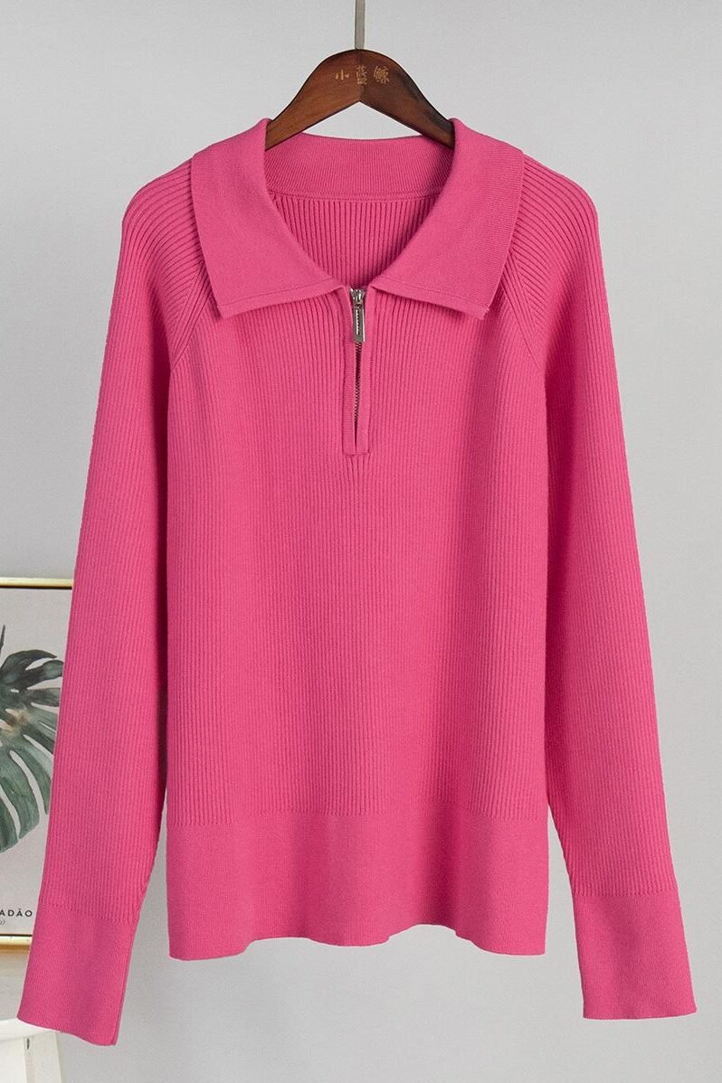 Chic knitted pullover features a unique polo/turn-down collar. Versatile and comfortable, perfect for elevating your casual autumn and winter looks