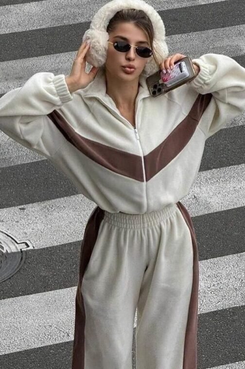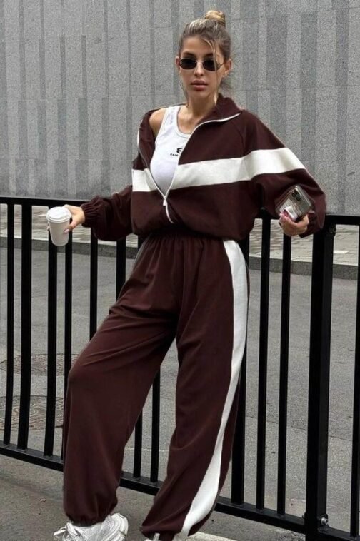 Stylish two-piece sports suit features a zip cardigan and pants in comfortable polyester. Perfect for a fashionable and versatile casual look.