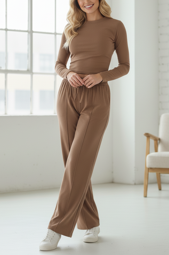 Women’s Two-Piece Set. Solid-color crop top with long sleeves and chic wide-leg pants. A versatile, modern outfit suitable for autumn and beyond.